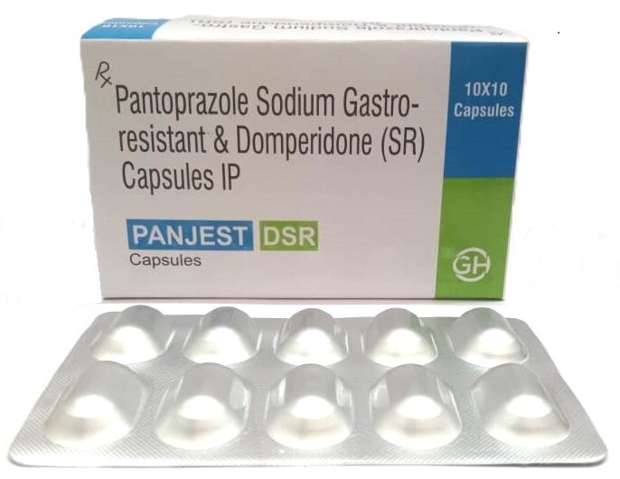 Panjest-DSR capsule is a combination gastrointestinal medication designed to provide effective relief from disorders associated with excessive stomach acid and impaired gastric motility. It brings together two complementary agents—Pantoprazole, a proton pump inhibitor, and Domperidone, a prokinetic—offering dual-action support for conditions such as gastroesophageal reflux disease (GERD), acidity, heartburn, gastritis, and symptoms linked to delayed gastric emptying. Pantoprazole is a well-established proton pump inhibitor (PPI) that works by inhibiting the H+/K+ ATPase enzyme system in the gastric parietal cells. By blocking this final step in acid production, pantoprazole significantly reduces the secretion of gastric acid. This helps in healing acid-induced inflammation of the stomach and esophagus, providing sustained relief from burning sensations, regurgitation, and irritation of the gastrointestinal lining. Domperidone 30 mg SR (Sustained Release) is a dopamine D2 receptor antagonist that enhances gastrointestinal motility. It promotes faster movement of food through the stomach, improves gastric emptying, and increases the tone of the lower esophageal sphincter. As a result, domperidone helps reduce nausea, bloating, early satiety, and reflux symptoms caused by stomach contents flowing backward into the esophagus. The sustained-release formulation ensures prolonged, steady action throughout the day. This combination capsule is typically formulated with inactive ingredients such as microcrystalline cellulose, lactose, and specialized release-controlling polymers. The SR technology ensures that domperidone is released slowly and consistently, improving therapeutic effectiveness while reducing dosing frequency. The medication is usually taken orally, preferably before meals, as directed by a healthcare professional. It should be used under medical supervision, especially for individuals with heart conditions, as domperidone may influence cardiac rhythm in rare cases. Common side effects may include headache, dizziness, mild gastrointestinal discomfort, or dry mouth. Serious reactions are uncommon but require immediate medical evaluation. Panjst-DSR capsule offers a comprehensive and long-lasting solution for managing acid-related conditions and improving digestive motility.